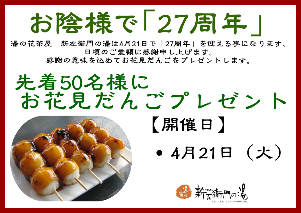 お陰様で「27周年」先着50名様に『お花見だんご』プレゼント